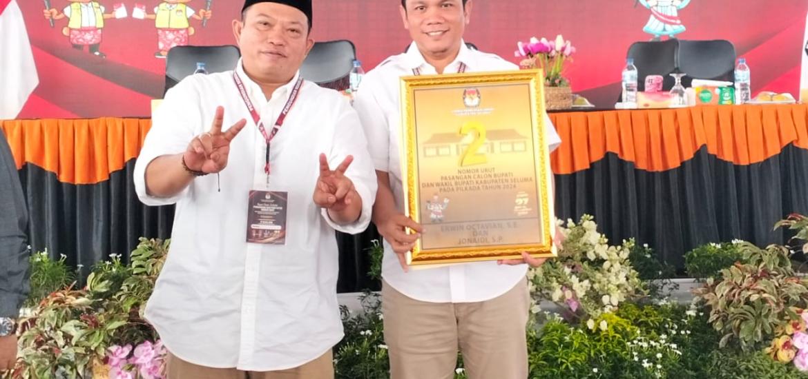 Seluma - KPU Seluma telah resmi menetapkan nomor urut Pasangan Calon (Paslon) Erwin dan Jonaidi sama dengan nomor urut Paslon Presiden terpilih Prabowo-Gibran.
